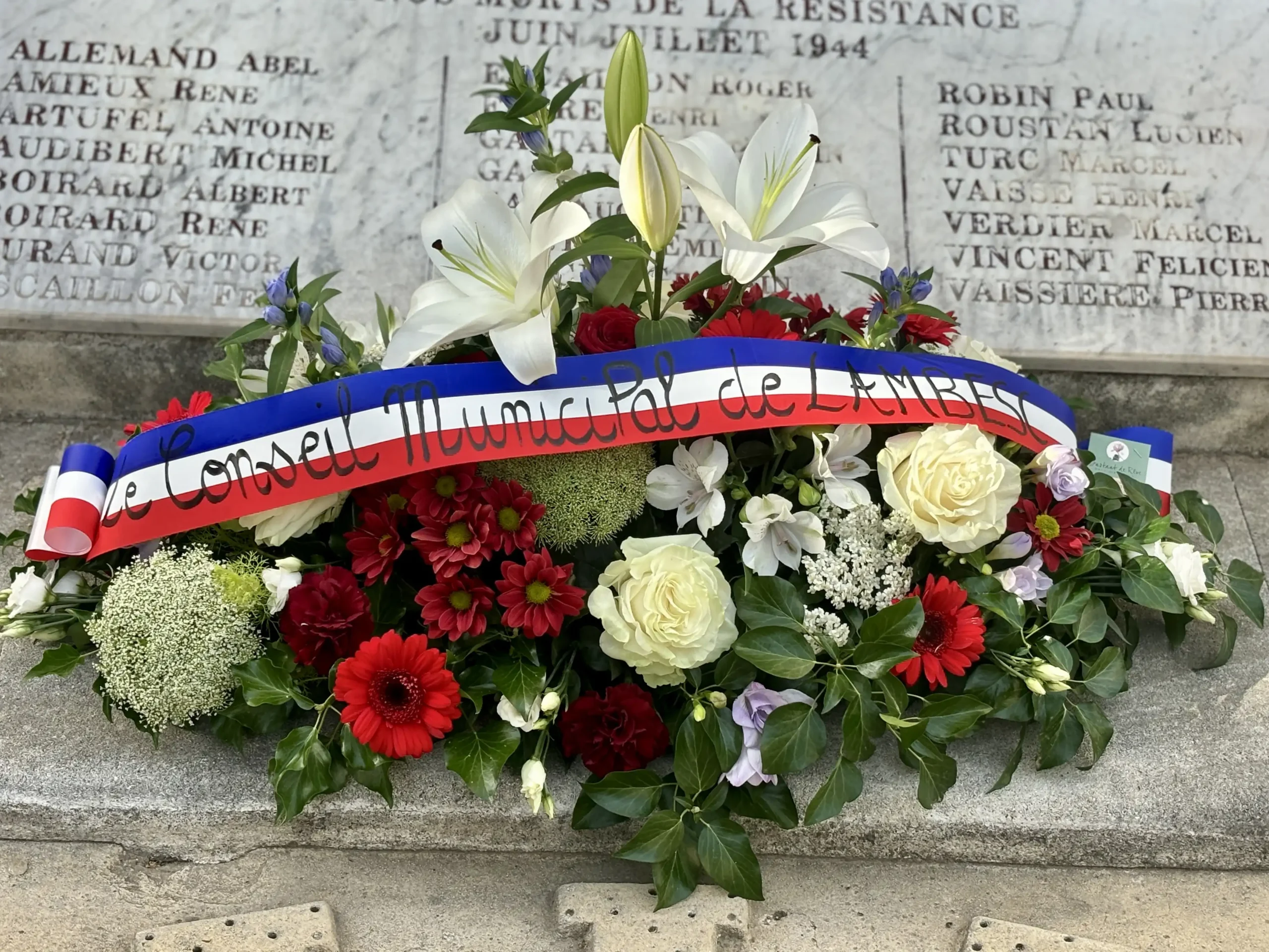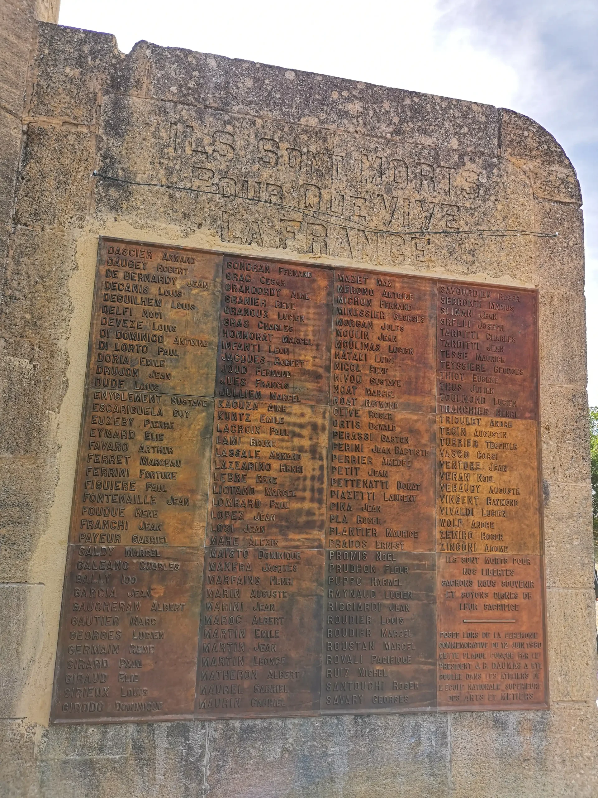 Sur les plaques au dos du mémorial se trouvent les noms des 62 maquisards fusillés ici, il y a 80 ans, quelques jours après le débarquement de Normandie et ceux de 210 autres résistants de notre canton tombés au combat pour nos libertés contre l’Allemagne nazie.