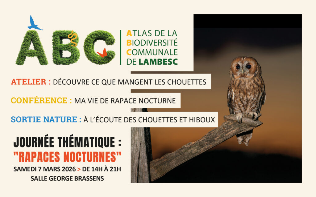 Partez à la rencontre des chouettes et hiboux de Lambesc lors d’une journée thématique dédiée aux rapaces nocturnes, organisée en partenariat avec la LPO PACA dans le cadre de l’Atlas de la Biodiversité Communale (ABC).
