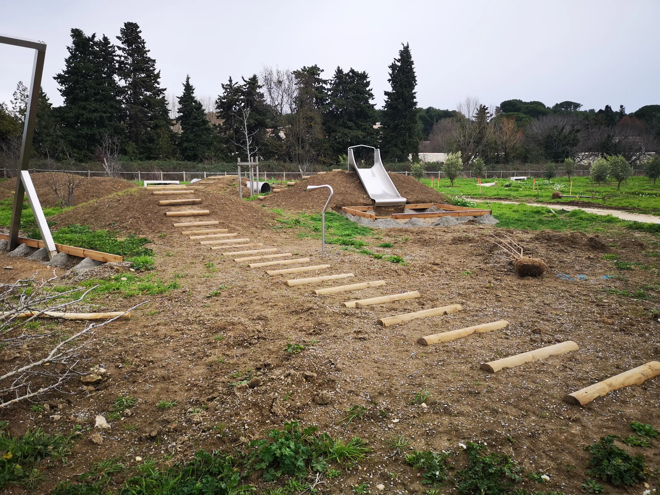 ♦ Jeux : changement de sol amortissant conçu à partir de copeaux de bois au niveau des jeux existants et reprise des buttes en terre.
